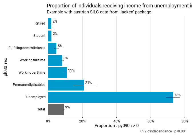 fonctionr comprend plusieurs fonctions pour réaliser facilement des opérations descriptives courantes. mean_group() permet par exemple de calculer des moyennes de revenu par groupe. Les groupes, ici de statut économique, sont indiqués dans l’argument group. C’est la moyenne du revenu mensuel qui est calculée, car on peut indiquer soit une variable quantitative, soit une expression pour calculer celle-ci, directement dans l’argument quanti_exp (dans ce cas la variable eqIncome est divisée par 12 à la volée). Le design de l’enquête SILC est pris en considération, puisque l’on peut indiquer les clusters (ids), les strates (strata) et les poids (weight) dans la fonction. Les intervalles de confiance et un test de différence des moyennes sont calculés en conséquence.
