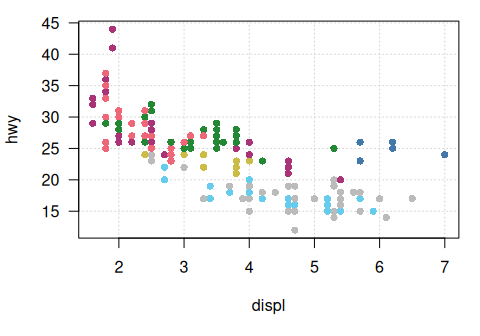 ggplot2::aes(x = displ, y = hwy, color = class) +