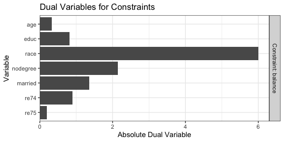We can see that race has the highest dual variable; relaxing the constraint on race would yield the biggest improvement in effective sample size, while tightening its constraint would yield the biggest decrease in effective sample size.