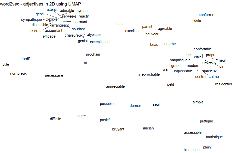 labs(title = "word2vec - adjectives in 2D using UMAP")